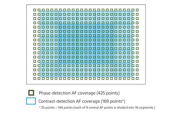 ソニー独自のファストハイブリッドAFを採用。425点の像面位相差AFと169点のコントラストAFが画面のほぼ全域をカバーするのがポイントだ