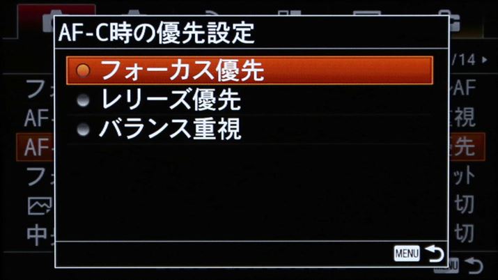 静止画のAF-C時の優先設定として「フォーカス優先」「レリーズ優先」「バランス重視」(初期設定)を選択できる