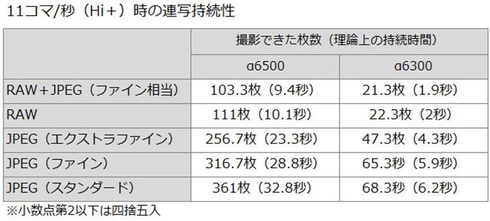 α6500とα6300の連写性能は同等で、Hi+モード時で最高約11コマ/秒、Hiモード時で最高約8コマ/秒の連写が可能。Hiモード時は、表示タイムラグを限りなく低減した状態で被写体を確認しながら撮れるライブビュー連写が行える。