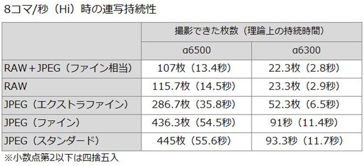 両モデルは同等の撮像素子とエンジンを採用している。性能面でもっとも大きな違いとなるのは、α6500が新開発のフロントエンドLSIと大容量のバッファーメモリーを搭載していることだ。これにより、α6300を上回る高速処理を実現し、連写の持続性が大幅に向上したのが最大の特徴。AF・AE追従で最高約8コマ/秒の連写が可能なHiモード(画質:ファイン)時に307枚(約36秒)の連続撮影が可能とアピールしている。