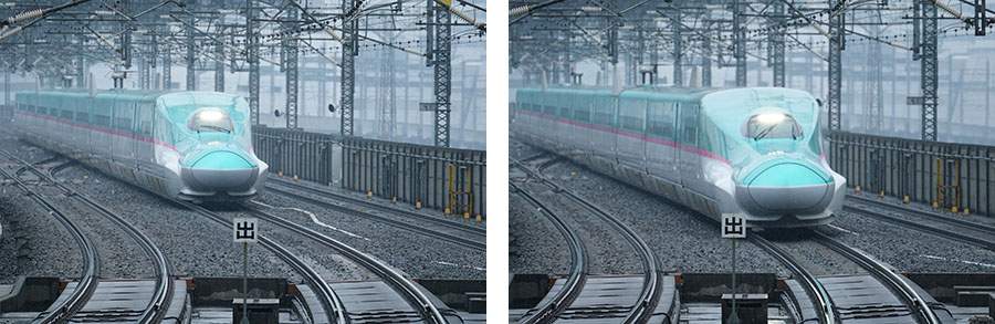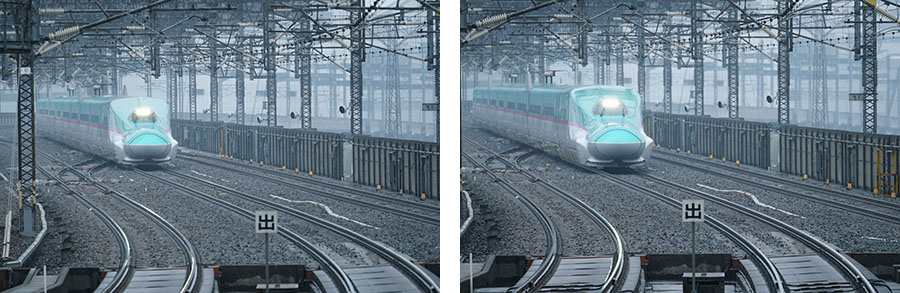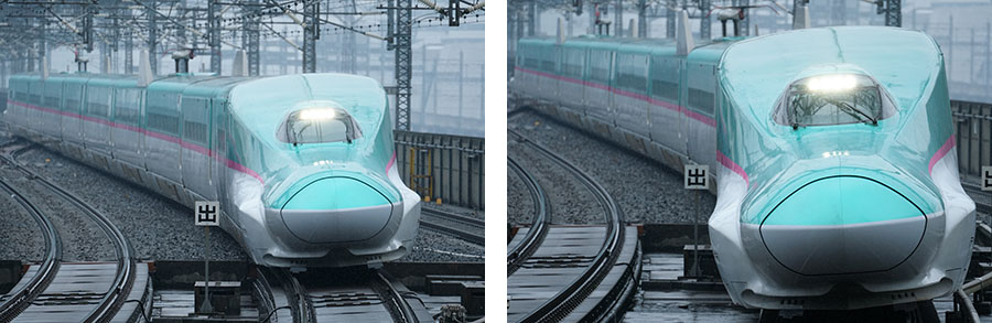 ホームに入ってくる新幹線を11コマ/秒の連写で撮影した。雨が降って気温が低い中での撮影だったため、ホワイトバランスを太陽光にして少し色温度を落として雰囲気を出してみた。JPEG(エクストラファイン)に設定しているが、連写のコマ速は計179枚まで落ちることはなかった。ホームに入ってきてもしっかりとピントが先頭車両に追従したことも押さえておきたい点だ。ただ、この作例では80〜90コマ付近でピントが少し手前に来てしまった。ピントはすぐに先頭車両の位置に復帰したものの、フォーカスエリアをワイドにしていると思わぬところにピントが動いてしまうことがあるので気を付けたい。