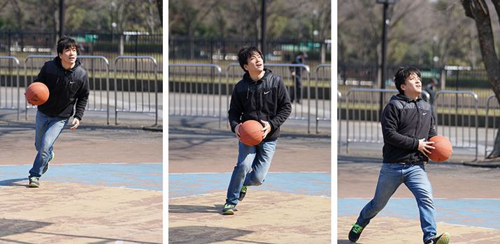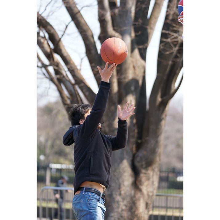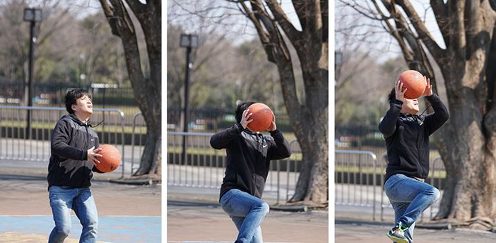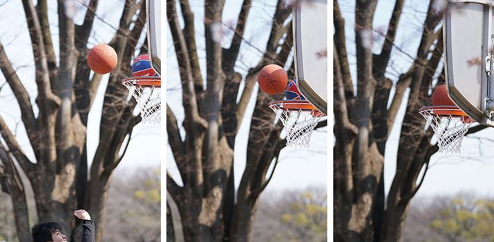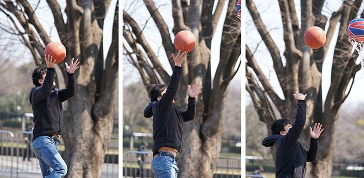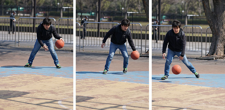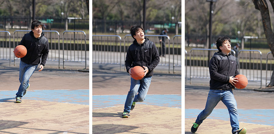 バスケのシュート練習をする男性を8コマ/秒の連写で撮影。8コマ/秒時は表示タイムラグが少なく、こうした不規則に動く被写体でも追いかけやすい。計32枚の撮影だがピントはすべて男性に合っていた。