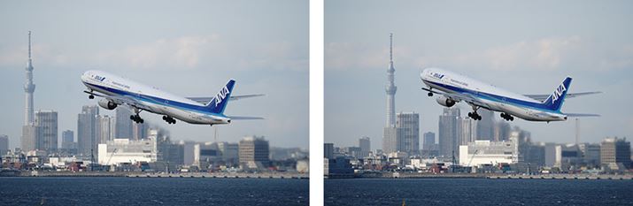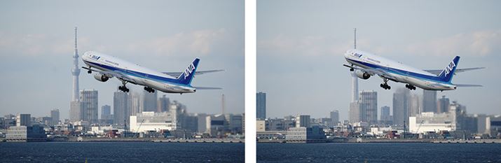 スカイツリーをバックにした構図を狙って撮った作例。飛行機の離陸は状況によって飛び立つポイントが異なるため、イメージどおりの構図になりにくいのだが、この作例では狙いどおりの写真を撮ることができた。11コマ/秒の高速連写によって、スカイツリーと飛行機の位置関係もうまく収まっている。前後のコマを見るとスカイツリーを横切る直前のこの作例がベストショットなことがわかるはずだ。