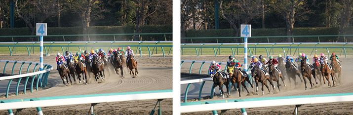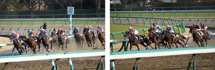 この作例は、モニターを上向きにして11コマ/秒連写で追従撮影したもの。ラチ(柵)の下の隙間から狙ったのがポイントで、連写できたのは2秒程度の短い時間だったが、競走馬が駆け抜ける瞬間を撮ることができた(この作例は1周目)。ややピントが甘いが、このくらいなら許容範囲ではないだろうか。なお、この作例は、モニターとファインダーの自動切り替えをオンにしたまま、モニターを上向きにしてウエストレベルに近い位置で構えて撮っている。α6300だとファインダーのセンサーが反応して表示が自動的にファインダーに切り替わってしまう撮り方なのだが、α6500は不意にモニターが消えないように改善されており、モニターを見ながら被写体を追従することができた。