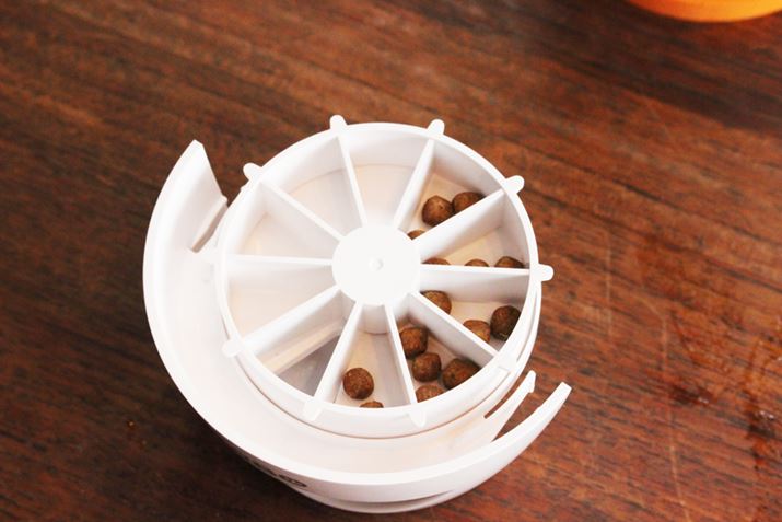 本体に内蔵されているおやつトレイ。9回分のおやつをストック可能です。おやつトレイは取り外して洗えるので常に清潔な状態を保てます