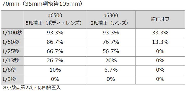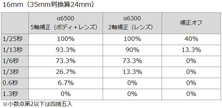全体的にα6500の5軸補正(ボディ+レンズ)のほうが結果がよく、広角の16mmでは約3段分の補正効果となる1/3秒での成功率が高くなった。望遠側ではそれほどの違いはないが、70mmでも300mmでもα6500のほうが2〜4段分程度のところでの効果が少し高くなった。
