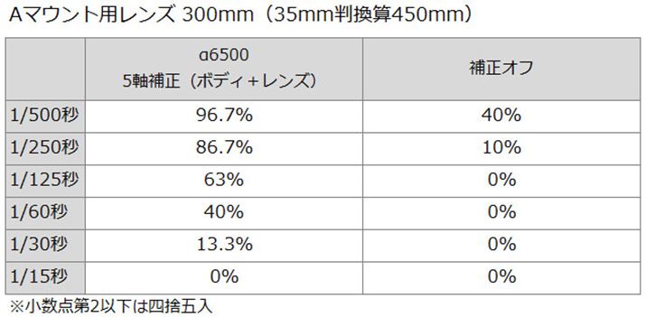 あわせて、Aマウント用レンズ使用時の手ブレ補正についても検証を行ったので結果を掲載しておこう。Aマウント用レンズは手ブレ補正非搭載となり、α6500ではボディ側での5軸補正となる。検証は、マウントアダプター「LA-EA3」を使ってAマウント用レンズ「70-300mm F4.5-5.6 G SSM II」を使用して焦点距離300mmで行った。結果は、Eマウント用レンズの同じ焦点距離と比べたときとほぼ同じか若干上回る成功率となった。