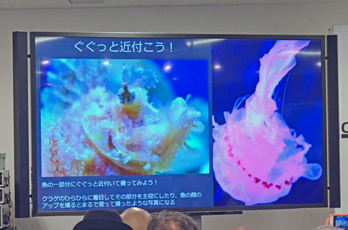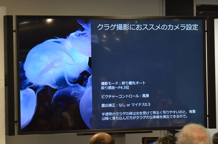 今回参加させていただいたセミナーのテーマは、「水族館撮影テクニック!」です。本家ニコンカレッジで行われているセミナーでは、座学のほか、実際に水族館にカメラを持っていき、現地での実践セミナーも行われているとのことでした。今回は90分の凝縮版ということで、実際に撮影した写真などを交えながら、水族館での基本的な撮影テクニックについて学びました。