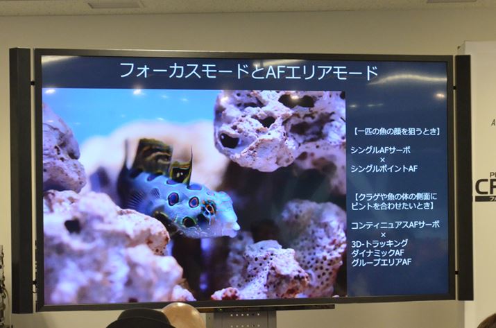 水咲奈々さんがおすすめする水族館撮影でのフォーカスモードとAFエリアモード。それぞれ状況に合わせて切り替えることで、もっとうまく撮影できるようになるそうです