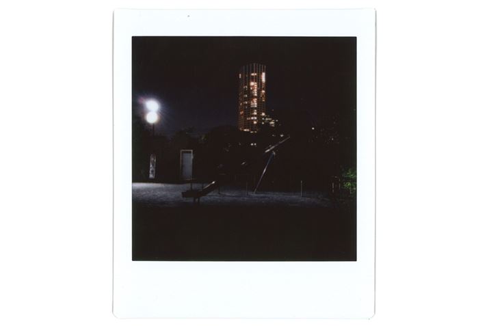 夜8時、街灯1つの暗い公園で、シャッターを2秒間開いて撮影。モニターの画像でははっきり写っていた手前の滑り台が潰れているので、もう少し画像を明るくしてからプリントしたほうがよかったかもしれない。しかし、高層マンションの部屋の明かりは、1つひとつがあまり潰れずにクリアに写し出されている