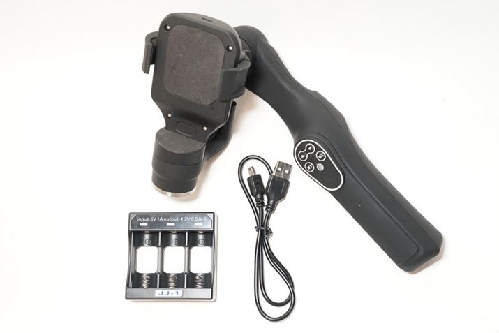 内包物は左から、充電用電池ボックス、充電ケーブル、スタビライザー本体です。このほかに充電池と日本語説明書も付属します