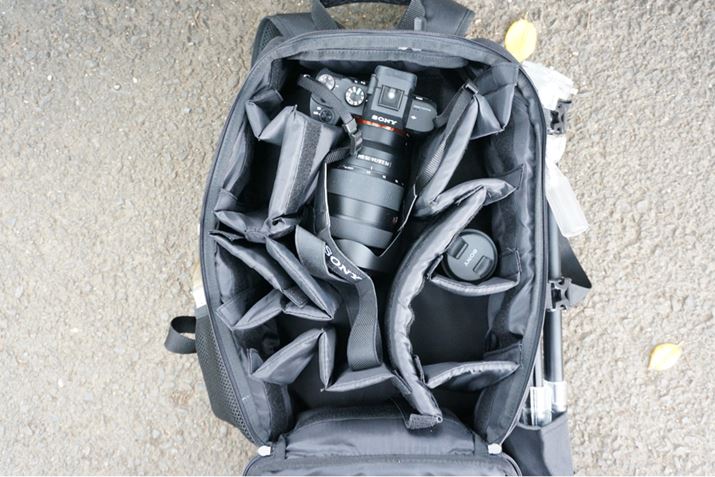 内部は間仕切りがいくつもあり、カメラボディーが2〜3台、レンズが数本入ります。ま、一般的なカメラリュックといえますね