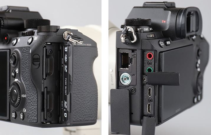 スロット1がUHS-IIに対応するデュアルカードスロットを採用。左側面には、有線LAN端子やシンクロ端子が搭載されている