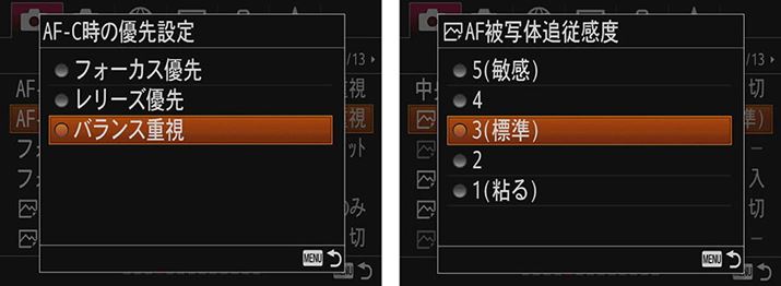 AF-Cでの静止画撮影時は、フォーカス/レリーズの優先設定と追従感度の設定が可能。追従感度は5段階から選ぶことができるが、もう少し細かい特性を追い込めるとさらに使いやすくなる