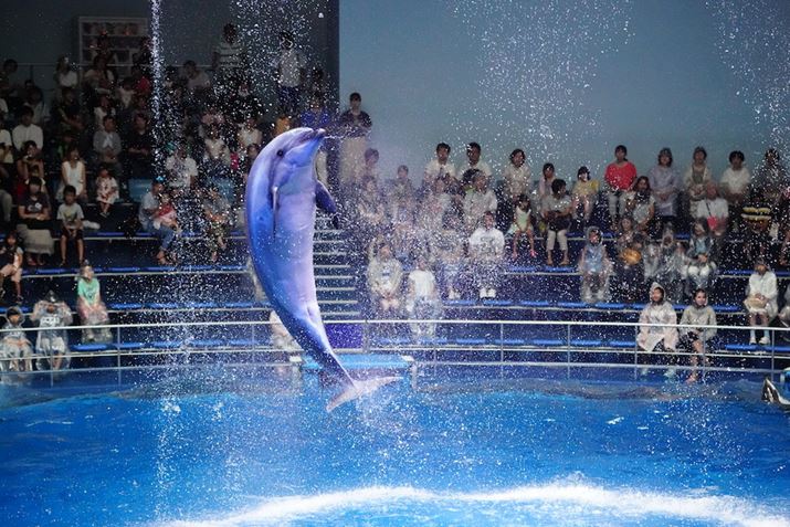 イルカが水面から飛び上がる様子を20コマ/秒連写で追従撮影。イルカがこちらを向いた瞬間を撮ることができた