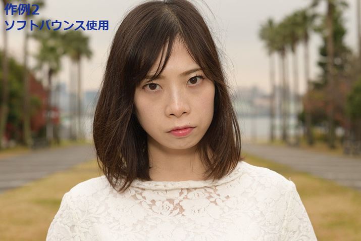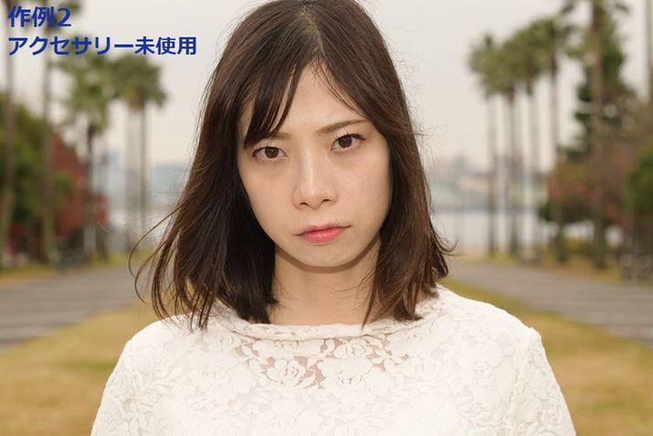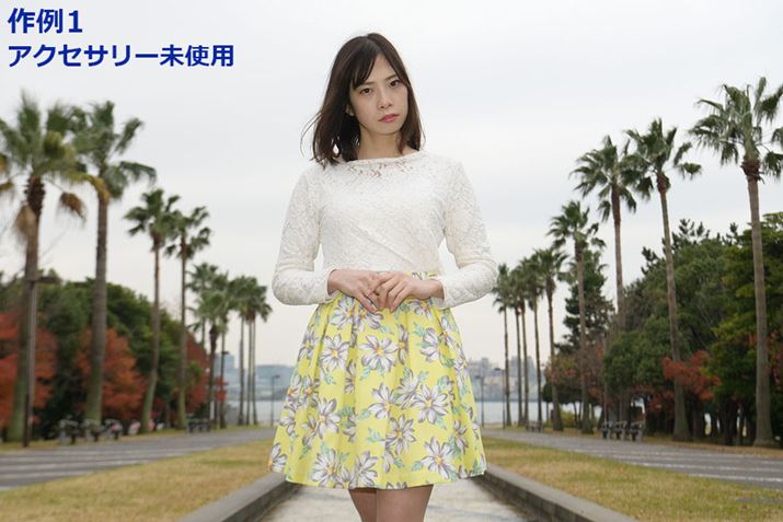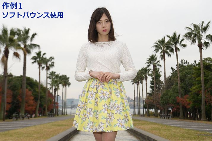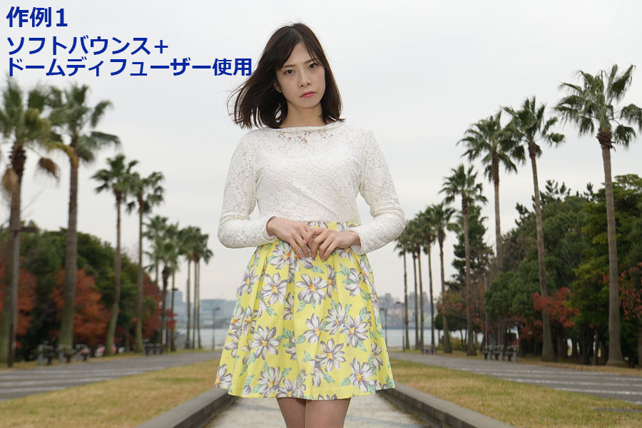 以下の作例では、アクサセリー未使用、ドームディフューザー使用、ソフトバウンス使用、ソフトバウンス+ドームディフューザー使用時の光の違いを撮り比べてチェックした。いずれもカメラの露出値はF8、1/125秒、ISO125にそろえたうえで、TTLで調光した後にマニュアルで少し発光量を補正して撮影している。屋外での撮影なのでバウンスさせることなく被写体に直接光を当てているが、作例1の4枚は服の明るさ、作例2の4枚は顔の肌の質感や、首のあたりの影のつき方を細かく見てほしい。アクササリーを使用することで硬い光がよりやわらかくなり、特色が変わることがわかるはずだ。