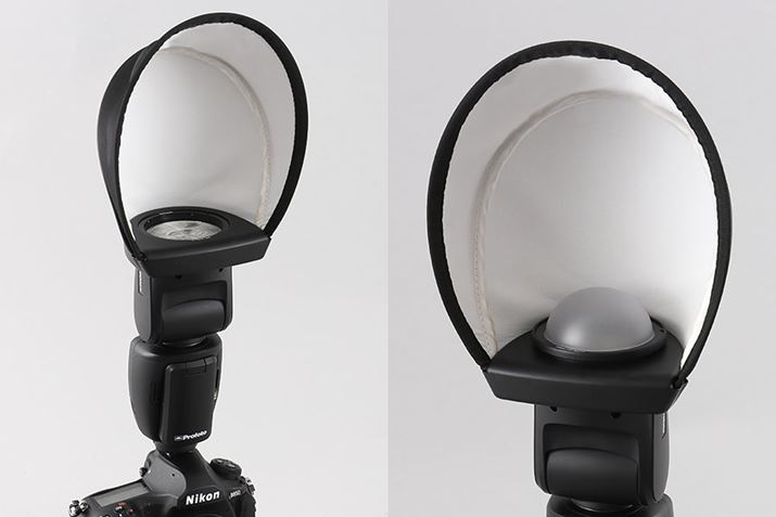 ソフトバウンスは、よりやわらかい光を作り出す。別売オプションで用意されており、価格は18,800円(税別)。右はソフトバウンスにドームディフューザーを重ねた様子