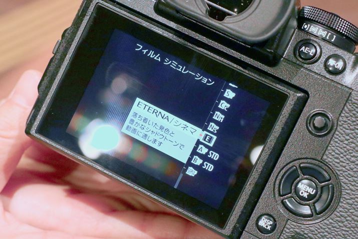 動画撮影機能も充実している。多彩な色調を実現する「フィルムシミュレーション」には、同社の映画用フィルムの色と階調を再現したETERNAモードを新搭載。同社の得意な「記憶色」と違い、動画撮影に適した落ち着いた発色と豊かなシャドウトーンが特徴のモードだ。映画用フィルムで培ったノウハウを生かした、映像に集中できる絵作りとなっている。