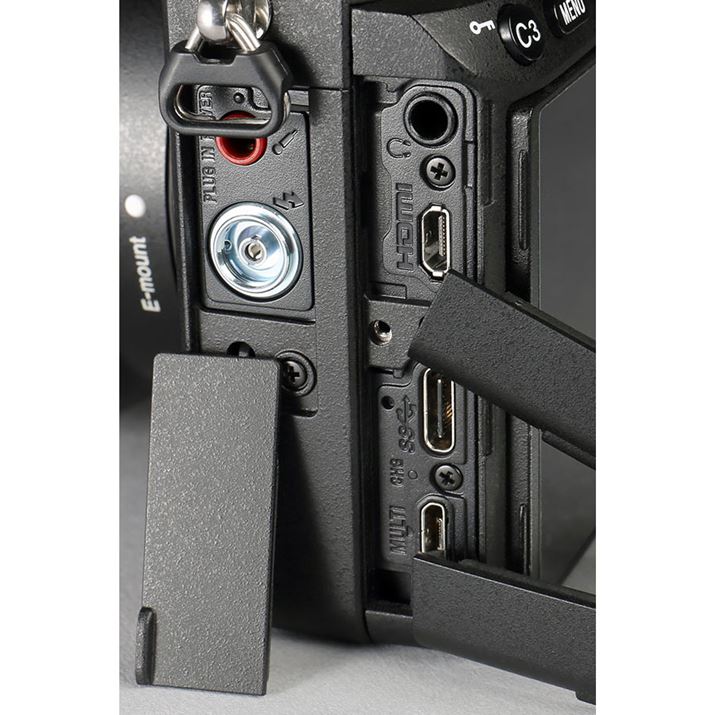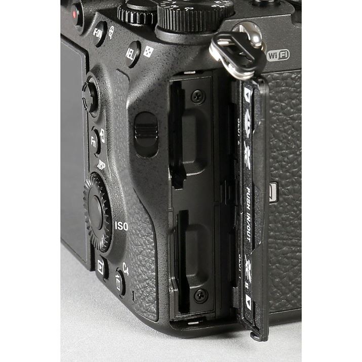 UHS-II対応のSDメモリーカードスロットと、SD/メモリースティックカードスロットのダブルスロットを採用。記録メディアの自動切り替えに対応するほか、UHS-II対応のスロット1はRAW、スロット2はJPEGといった静止画記録の振り分けも可能だ