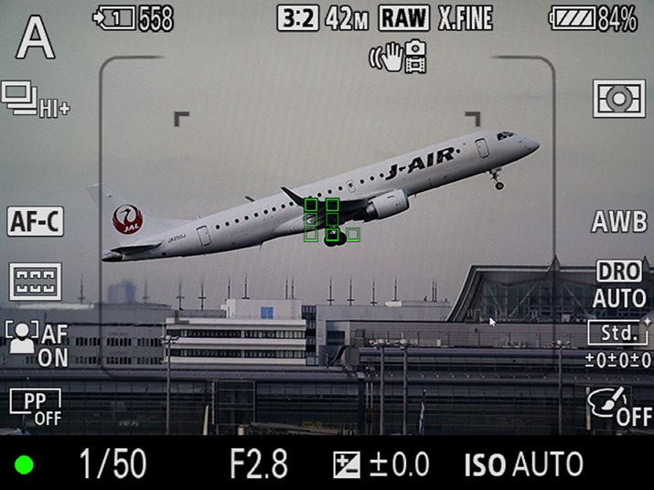 連写は、有効約4240万画素の高画素機ながら、AF・AE追従で最高約10コマ/秒を達成。連写中の表示タイムラグを限りなく抑えたライブビュー方式でも最高約8コマ/秒の連写が可能だ。連続撮影可能枚数は、JPEG(画質モードによらず)、RAW(圧縮)、RAW(圧縮)+JPEGのいずれでも約76枚。10コマ/秒時でも7秒以上連写が続くようになっており、持続性も十分だ。スペック的にはまったく不満のない連写性能である。