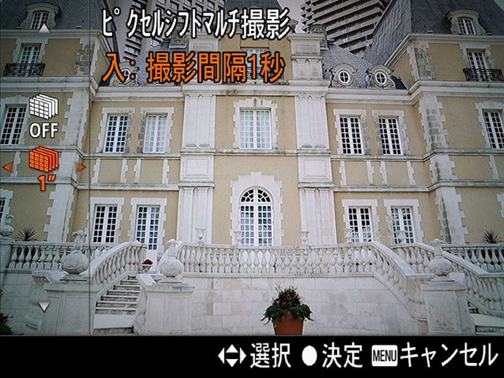 ピクセルシフトマルチ撮影の設定画面。撮像素子を1画素分ずつずらしながら電子シャッターで計4枚の撮影を行う。撮影間隔は1/2/3/4/5/10/15/30秒を選べるが、フラッシュのチャージのために時間に余裕を持たせるなどの理由がない限り、最短の1秒に設定しておくのがいいだろう。なお、ピクセルシフトマルチ撮影時のフラッシュ同調速度は1/13秒となっている