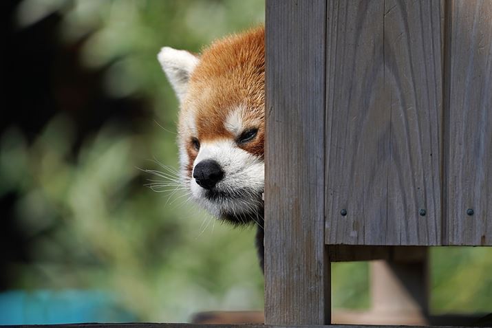 眠っていたレッサーパンダが小屋から顔を出した瞬間にシャッターを切った1枚。この作例では、ピント位置の解像感の高さをチェックしてほしい。JPEG撮影のデータだが、目の周りの黒い部分や鼻、毛並みなどが非常に高精細に写せている