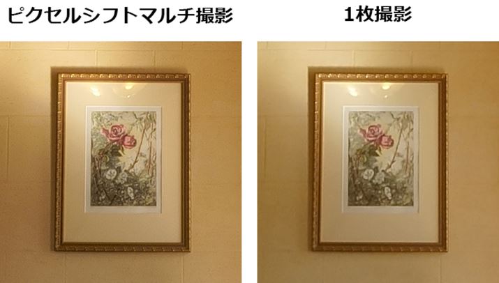 左は、上に掲載したピクセルシフトマルチ撮影を利用したもので、右は1枚撮影のRAWデータからJPEGに現像したもの。画像中央部の同じところを等倍で切り出しているが、その差は歴然。12mmの超広角撮影でカメラから離れたところを切り出して比較しているのに、ここまで解像感に差が出るのはすごい