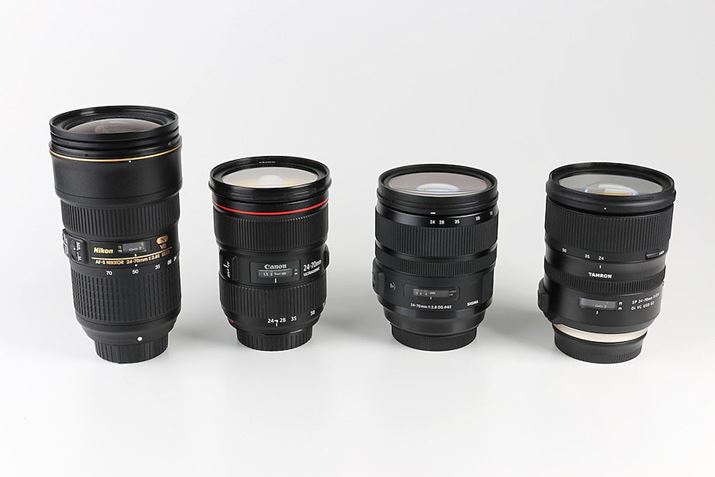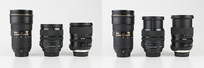 左からニコンAF-S NIKKOR 24-70mm f/2.8E ED VR、キヤノンEF24-70mm F2.8L II USM、シグマ24-70mm F2.8 DG OS HSM | Art、タムロンSP 24-70mm F/2.8 Di VC USD G2 (Model A032)