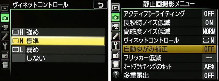 シグマArt24-70mm、タムロンSP24-70mmとも、ニコンのカメラボディ(D850)ではヴィネットコントロールを利用できる。自動ゆがみ補正は選択できない