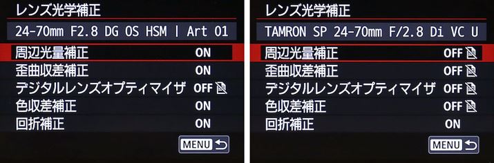 キヤノンのカメラボディ(EOS 5D Mark IV)を利用した際のレンズ補正の設定画面(左がシグマArt24-70mm、右がタムロンSP24-70mm)。ファームウェアアップデート後のシグマArt24-70mmであれば周辺光量補正、歪曲収差補正、色収差補正が働く