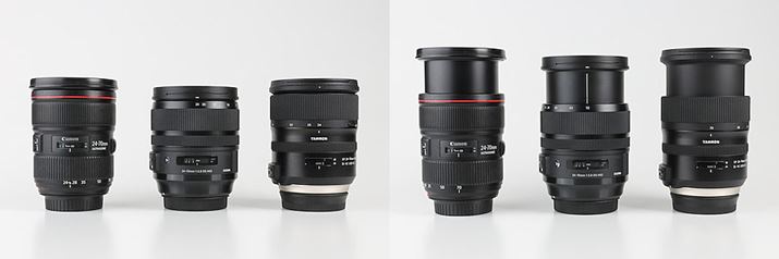 左からニコンキヤノンEF24-70mm、シグマArt24-70mm、タムロンSP24-70mm。画像左側はレンズがもっとも短い状態(広角端)で、右側がもっともレンズが繰り出した状態(望遠端)。サイズ感で3モデルに大きな違いはないが、重量はキヤノンEF24-70mmがもっとも軽い