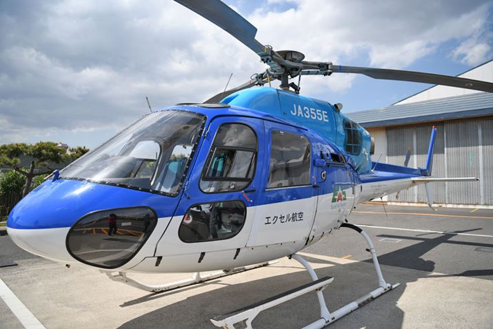 今回のツアーで使用したヘリコプター「ユーロコプター AS355N」。今回のツアーでは、4人乗りの後部座席の中央に加藤先生が、両サイドの窓際に参加者がそれぞれ搭乗する形で行われた