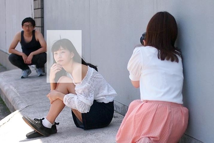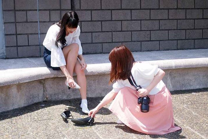 米田「この写真は『しえるさんが歩いているときに靴ずれを起こしてしまって、その痕を確認するために靴下を脱いだ』というストーリーにしたいんです。ところが、しえるさんが履いている靴はスニーカーなので、靴ずれを起こしそうにないんです。そこで、私の履いているパンプスをここに置きます」
