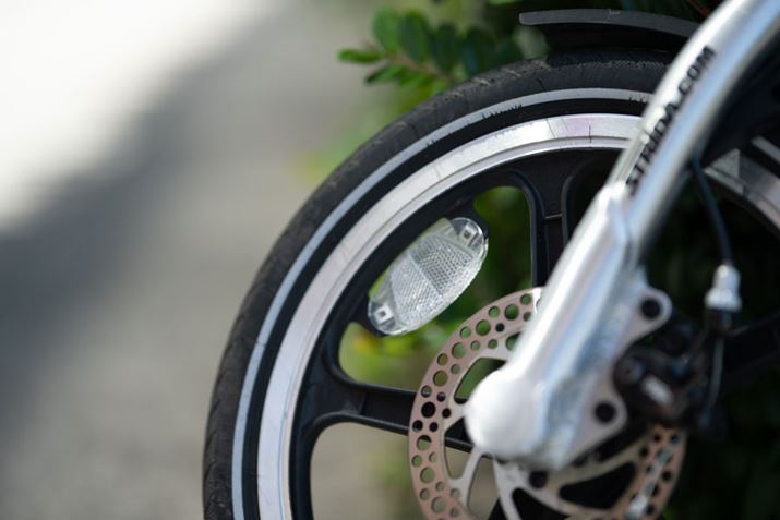 晴天時に路上のバイクを撮影。ホイール上部にピントを合わせたが、金属ものの周囲に現れる紫と緑の色がきわめて少ない