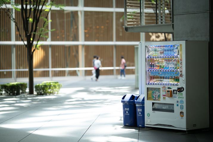 晴天時のビル街でのスナップ撮影。何気ない自動販売機がふわっと浮かび上がるようなコントラストの描写