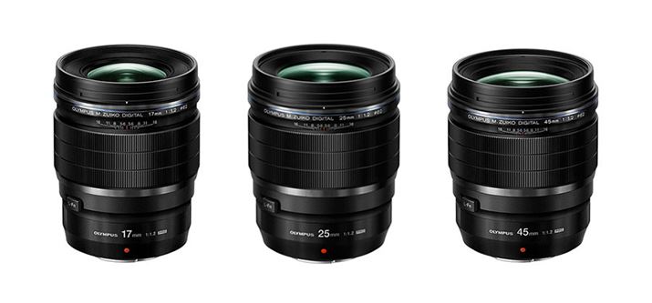 F1.2大口径単焦点シリーズの3本。左からM.ZUIKO DIGITAL ED 17mm F1.2 PRO、M.ZUIKO DIGITAL ED 25mm F1.2 PRO、M.ZUIKO DIGITAL ED 45mm F1.2 PRO