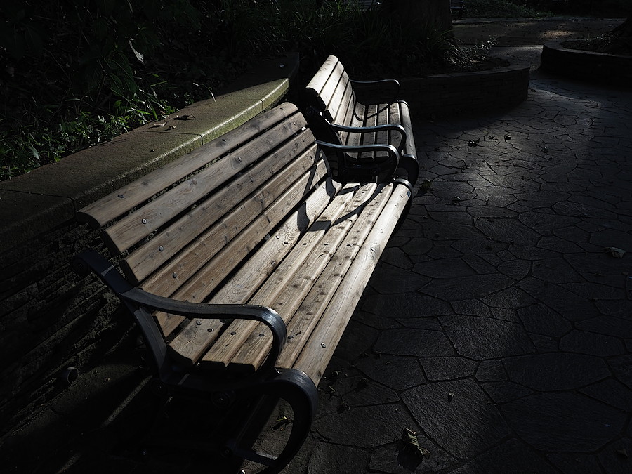 木陰のスポットライトを生かして、絞り値F6.3で撮影した作例。主要被写体(ベンチ)周辺の薄い光が差し込んだところに注目してほしい。光をよく拾ってくれる印象で、シャドーから中間調くらいのトーンがしっかりと出ている