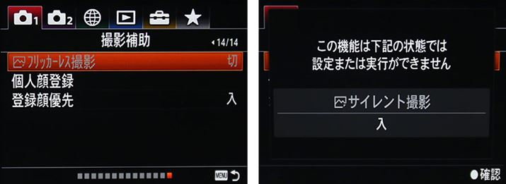 α7R IIIのメニュー画面。電子シャッター(サイレント撮影)をオンにすると、「フリッカーレス撮影」は自動的にオフになり、表示もグレーアウトとなる