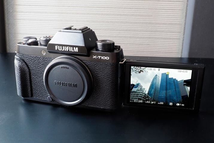 「X-T100」はチルト式で自撮りするときだけ、液晶画面を左側から180度反転してレンズ側に向けられる方式だ。これにそんなにメリットがあるとは思えないが、20代の女性に聞いてみると自撮りできないカメラは購入候補外だそうなので、スマホ世代には必要不可欠なのかもしれない。
