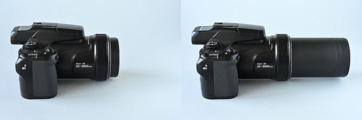 左が広角端、右が望遠端。広角端のときの全長(ファインダー接眼部からレンズ先端まで)は約21cm。望遠端のときはさすがにレンズが伸び、全長は31cm程度となる