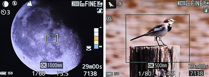 COOLPIX P1000は月や野鳥の撮影に適したデジカメだ。自動的に3秒のセルフタイマーになり、色合いをコマンドダイヤルで変えられる「月モード」(左)と、自動的に連写モードとなる「野鳥モード」(右)が用意されている。いずれのモードも、OKボタンを押すと指定した焦点距離まで一気にズームが伸びるようになっている