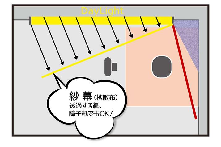 「光源面」を窓の位置より有利な場所まで「引き込んだ」ことになります。なお、今回紗幕を使いましたが、同じ面積があれば「トレーシングペーパー」や「障子紙」などの光を半透過する紙を使ってもかまいません。ただ、紙の場合、この位置に設置するには、それなりの工夫が必要でしょうけど……。