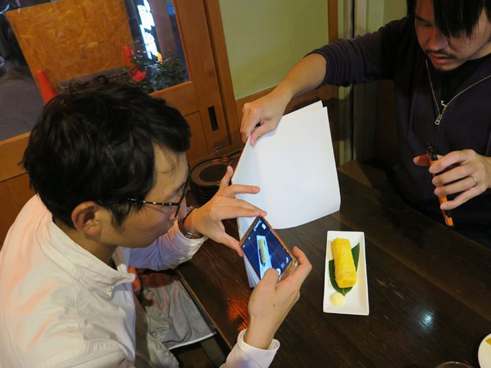 卵焼きをスマホで撮る僕。向かいでスマホのLEDライトを光らせるヨシダさん