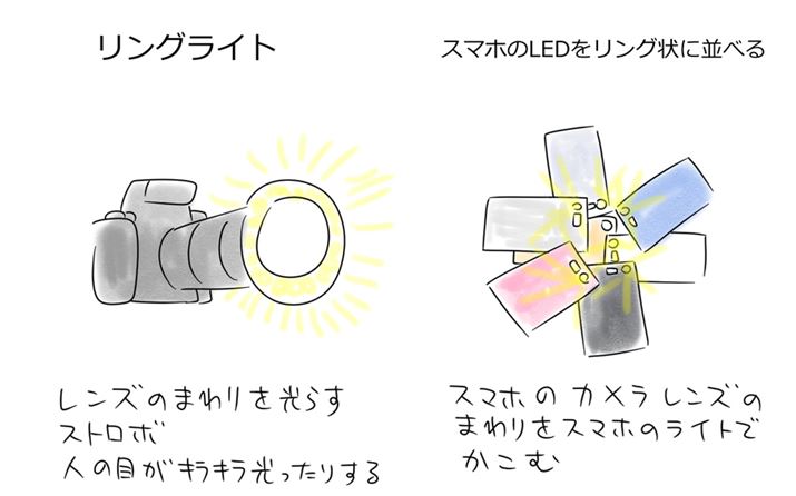 ヨシダ「う〜ん。強いて言えば、スマホのレンズの周りに、スマホのLEDライトを丸く配置して、『リングライト』という機材に近い効果になるかなあ……?」