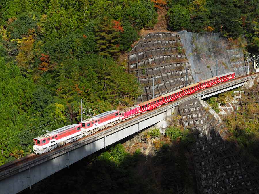 日本唯一のアプト式電車である「南アルプスあぷとライン」(井川線)を、アプト式機関車を連結して走らせる、アプトいちしろ駅から長島ダムの間で撮影した作例。ホワイトバランスを晴天、階調を標準にすることで、車両の赤と木々の緑がより深い色になるようにした。