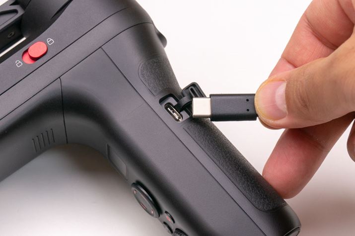 ジンバル本体にUSB-Cケーブルを繋いで充電可能。なお、残量ゼロから満充電までに必要な時間はメーカー公称で約2時間30分です