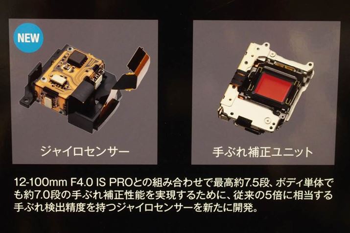 新開発のジャイロセンサーを搭載し、ボディ単体で最高7.0段分、M.ZUIKO DIGITAL ED 12-100mm F4.0 IS PRO使用時で最高約7.5段分の手ブレ補正効果を実現