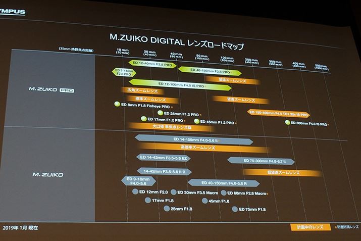 レンズのロードマップも更新。「M.ZUIKO PRO」シリーズでは、広角ズームレンズ1本、標準ズームレンズ1本、M.ZUIKO DIGITAL ED 150-400mm F4.5 TC1.25x IS PROを除いて望遠ズームレンズ2本、大口径の単焦点レンズ群などの開発が予定されている