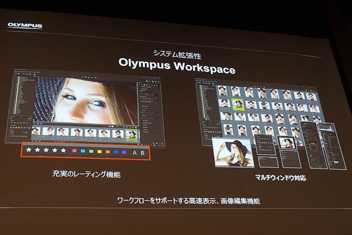 「Olympus Viewer 3」に代わるPC用画像編集ソフト「Olympus Workspace」も登場する。マルチウィンドウ対応、プロユースに対応する高度なRAW現像・編集など機能が大幅に刷新されるという