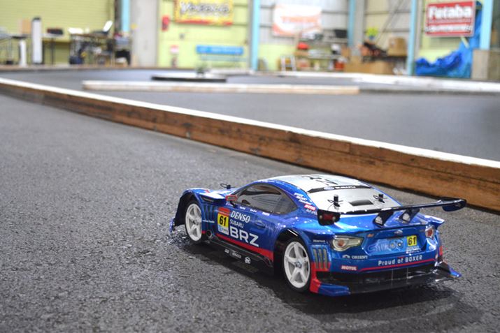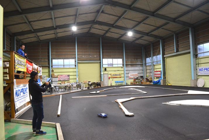 行きつけのラジコンショップ「スーパーラジコンさいたま大宮店」の村井店長さんの許可と協力を得て、ほかのお客さんがいないときに、愛車(電動ラジコンカー)の走りを空撮!